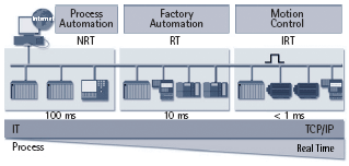 对于更高实时要求的工厂自动化应用,PROFINET RT是一个正确的选择。I/O数据交换直接使用Ethernet协议,而配置诊断使用标准的UDP/IP。PROFINET RT能够应用于循环周期> 10 ms的应用。