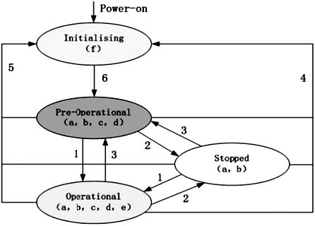 每个CANOpen节点内都运行着一个状态机,状态转换由主节点控制,不同的状态对应不同的节点任务,也对应了不同的模块可用性。状态转换如图4所示。