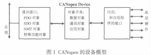 CANOpen的设备模型可以分为三个部分 :通讯接口及协议软件、对象字典、过程接口和应用程序。其中 ,通讯接口和协议软件提供通设备和总线之间的连接服务 ,对象字典描述了所有的数据类型、通讯对象和设备用到的应用对象 ,它提供了和应用软件的接口 ,过程接口和应用程序提供了设备内部的控制机制。它们之间的关系如图 1所示。