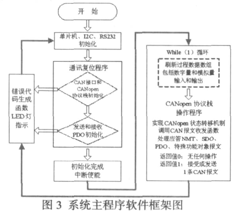 CANOpen协议的软件实现遵循 CANOpen协议预定义主 /从连接集 ,从站节点支持 4个接收 PDO,4个发送 PDO,1个 SDO,1个紧急对象和 1个节点错误控制对象。相关的协议细节可查看文档。结合通讯协议的特点 ,软件设计中采用结构体的方式来定义诸如 CAN报文、发送和接收 PDO配置对象、CANOpen协议配置对象等 ,通过定义结构体型指针变量完成对对象中相关数据的读写 ,给程序的编制带来了方便。此外 ,利用定义数组的方法实现了对象字典和过程数据影像的操作。在 SDO报文处理子函数中 ,通过被访问对象的主索引和子索引 ,以数组查询的方式实现了对对象字典的读写访问。CANOpenI/O从站的状态机转换通过判断接收 NMT报文命令字 ,对心跳报文标志字节代码进行读写 ,产生程序散转的方式得以实现。对于 PDO、SDO通讯对象的处理则根据心跳报文标志字节代码指明的当前状态分别进行处理。
