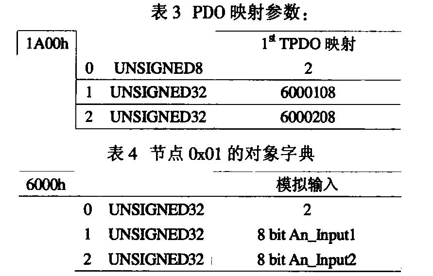 如 ,一个 CANopen节点 (Node_ID为 0x01)具有两路模拟输入 ,必须满足 PDO链接和映射机制。PDO映射参数、节点的对象字典、PDO通讯参数及 TPDO的数据格式如表 345和 6所示。