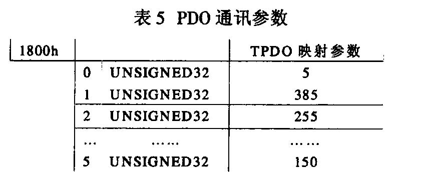 表 5反映了 PDO的通讯参数。对于通讯参数索引为 1800h,子索引为 2,所表示的就是传送类型 ,值 255表示 PDO的 COB-ID为 181h(十进制为 385)的对象可以采用周期性或非周期性的同步的传送方式。对于 TPDO而言 ,可以设定事件定时器 ,利用事件驱动传送。定时事件由 TPDO的索引 1800,子索引 5来设置。当节点检测到输入通道的测量值发生变化时 ,就产生触发 PDO传送的事件。在本例中 ,采用定时 150ms发送一次 TPDO的事件。