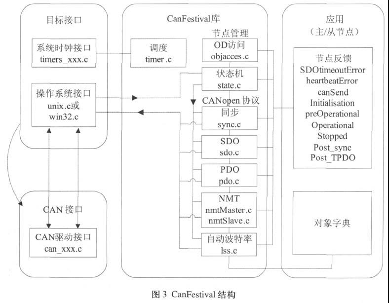 本文采用 CanFestival V3.0 RC3,以开源 CANopen协议栈在微控制器上加以实现。Canfestival协议的结构如图 3所示。