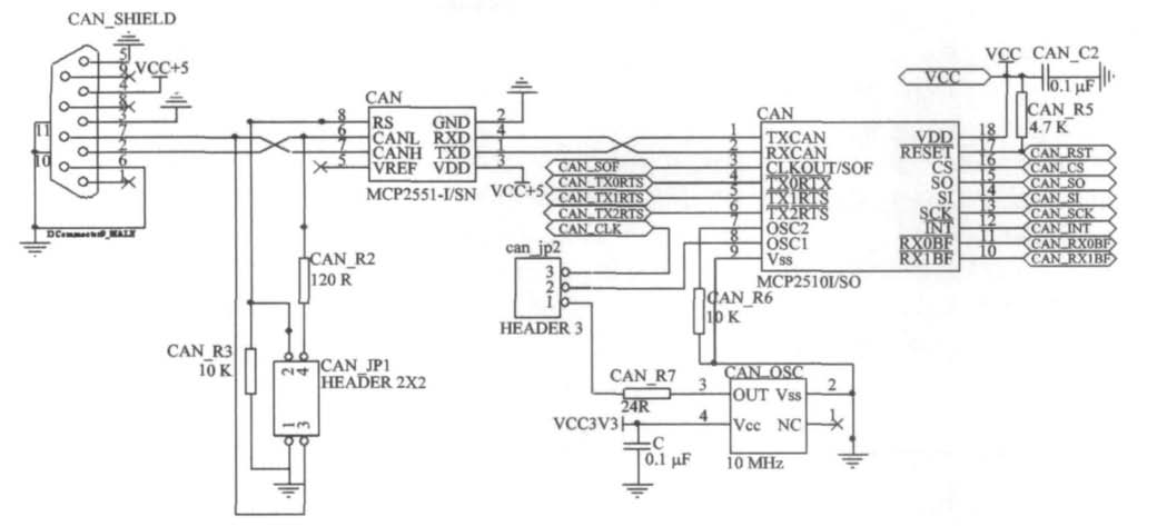 CANopen应用层芯片加上 CAN控制器和 CAN收发器是构成 CANopen主站的三大部分,在外加一些外围电路就形成 CANopen主站的硬件电路,原理图如图 3所示,MCP2510通过 SCK、SI、SO和 CS与 FPGA的 I/O接口相连。