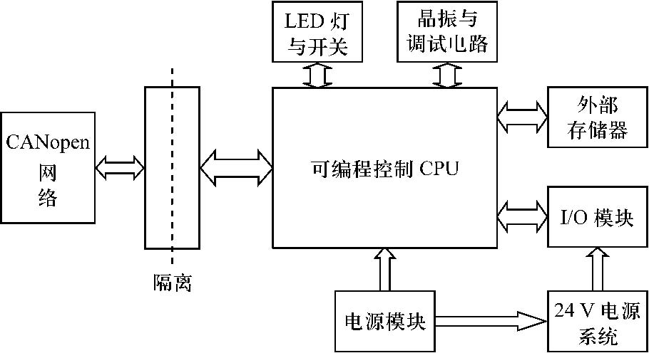 CANopen主站的硬件主要由电源模块、CPU模块、存储器模块、I/O模块、CANopen模块和其他模块组成。具体的硬件框图由图 1组成。