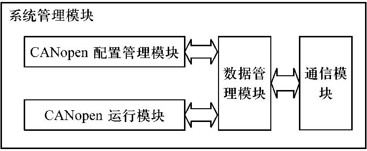 CANopen主站主要包括以下几个模块 :系统管理模块、数据管理模块、CANopen配置管理模块、CANopen运行模块、通信模块,如图 2所示。