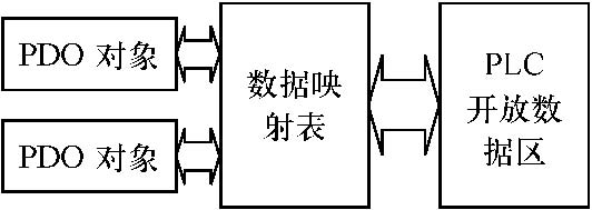 CANopen主站是以模块的形式与 PLC相结合。由于 PLC需要运行用户程序,为了不影响用户程序运行,CANopen主站模块作为一个任务独立于 PLC运行。CANopen主站中的数据管理模块专门负责与 PLC任务进行数据交换。在数据交换的过程中,以数据映射的方法完成 CANopen主站模块与 PLC的数据交换。数据映射机制如图 5所示。